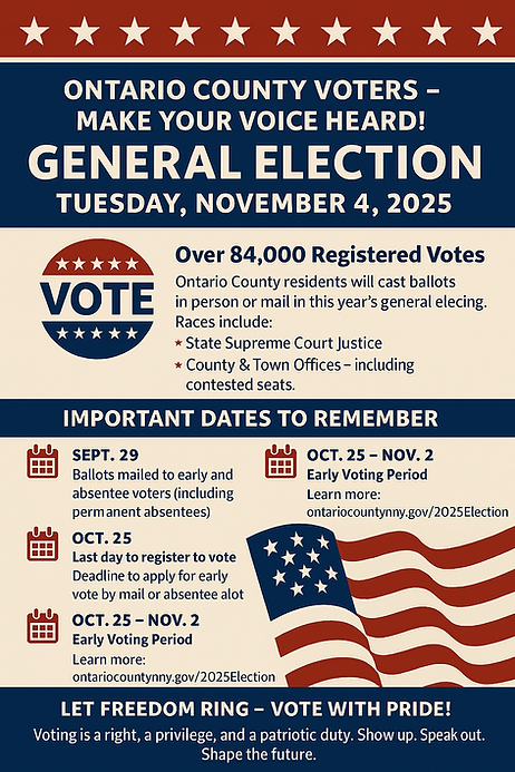 The Ontario County Republican Committee is launching our 2025 Chairman’s Club and welcome you to join this year! We need YOUR help this year to get our team over the line. The past election was exciting for our party. We won back the White House, the Senate, and retained the House! There is a genuine wave of enthusiasm and heartfelt hope for our nation. We are excited to build upon the red wave in New York and locally in Ontario County!